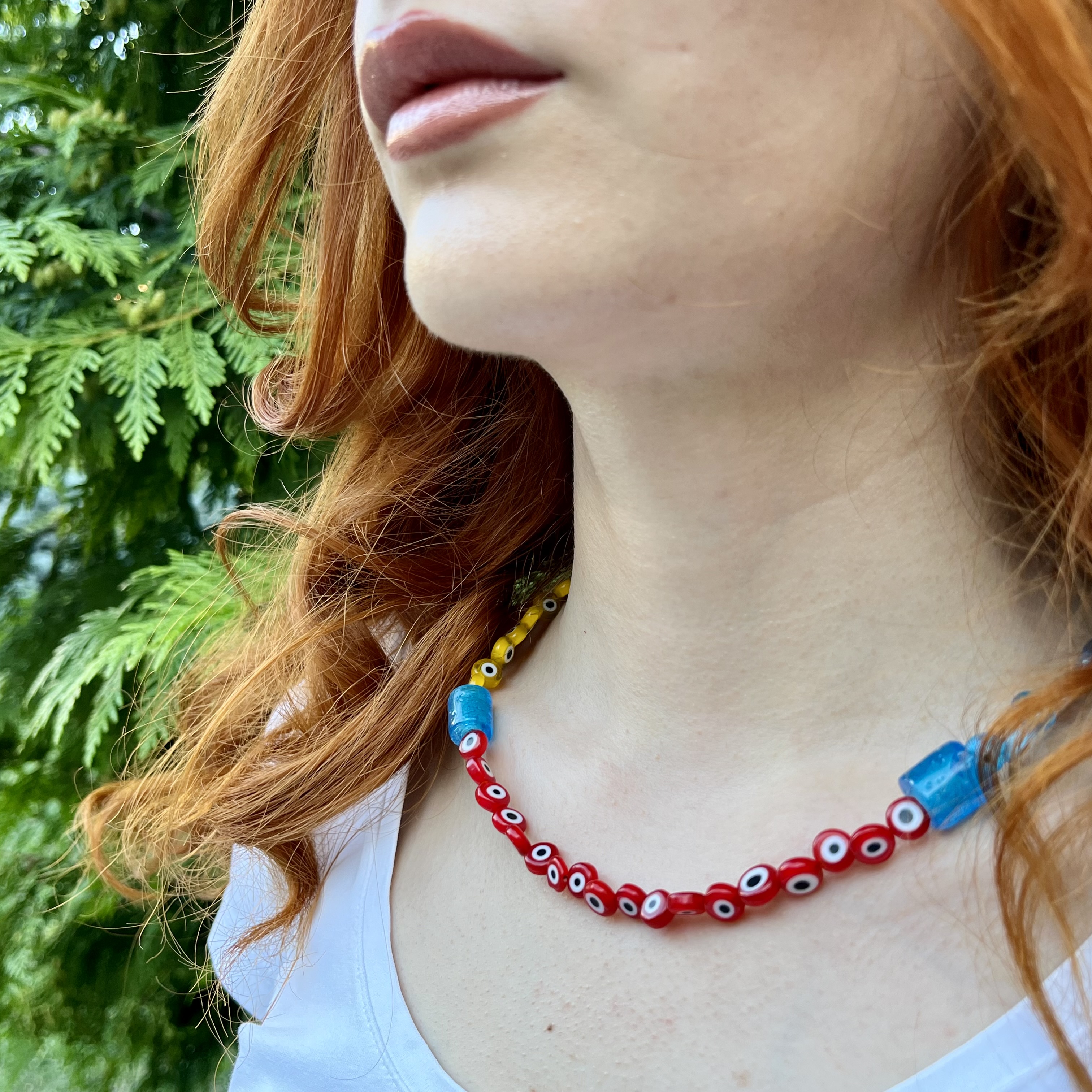 El yapımı cam nazar boncuklar, ateşte şekillendirilir ve her biri kendine özgüdür. Camın doğal dokusu ve renk derinliği, tasarıma sıcak ve yaşayan bir karakter kazandırır.