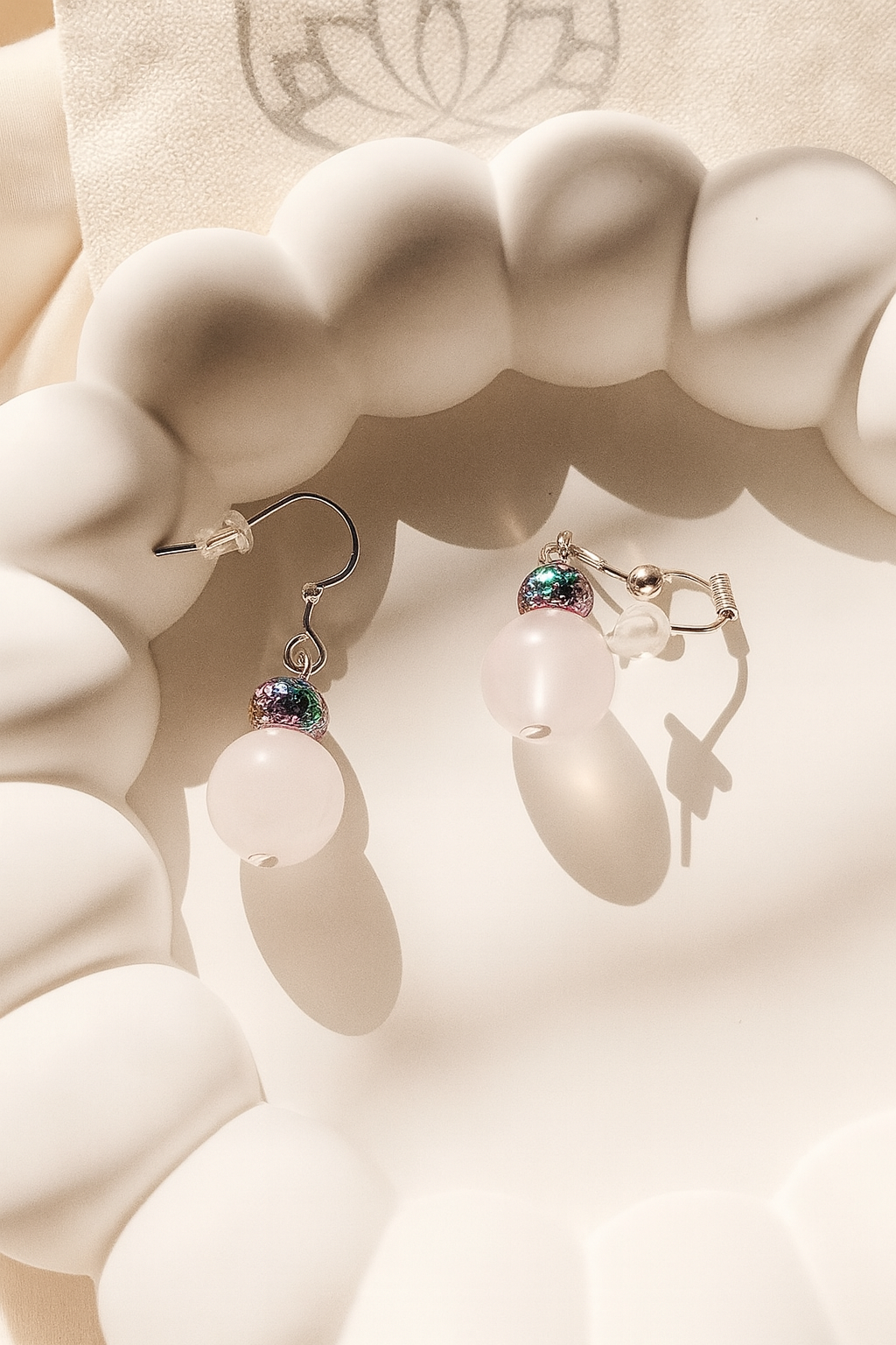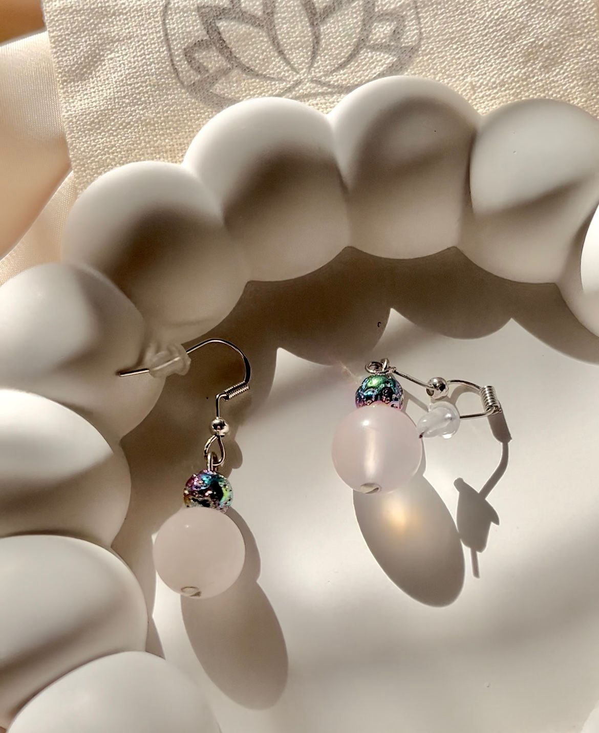 Pembe kuvarsın yumuşaklığı ile hematitin güçlü dokusu, bu tasarımda dengeli bir uyum oluşturur.