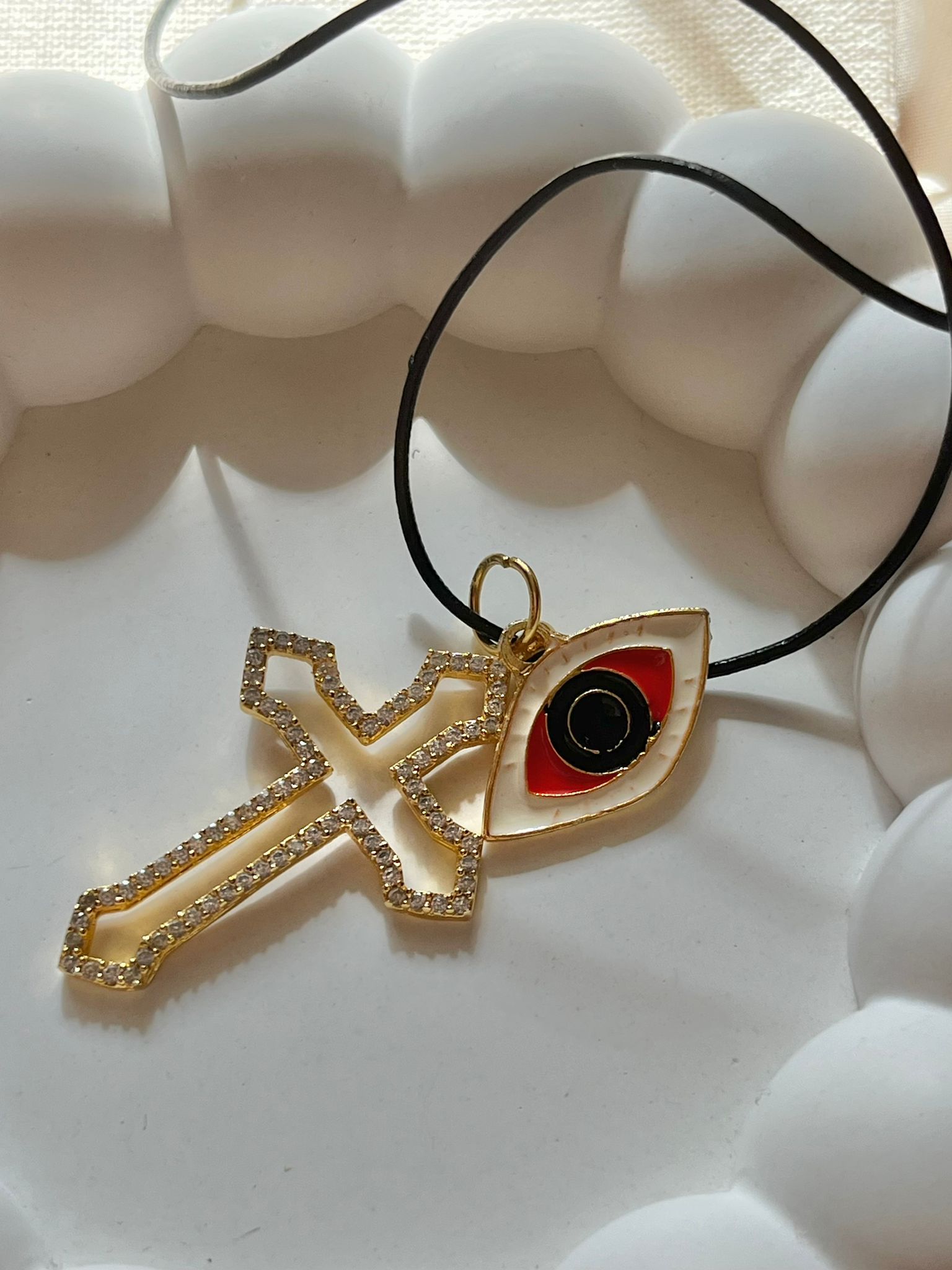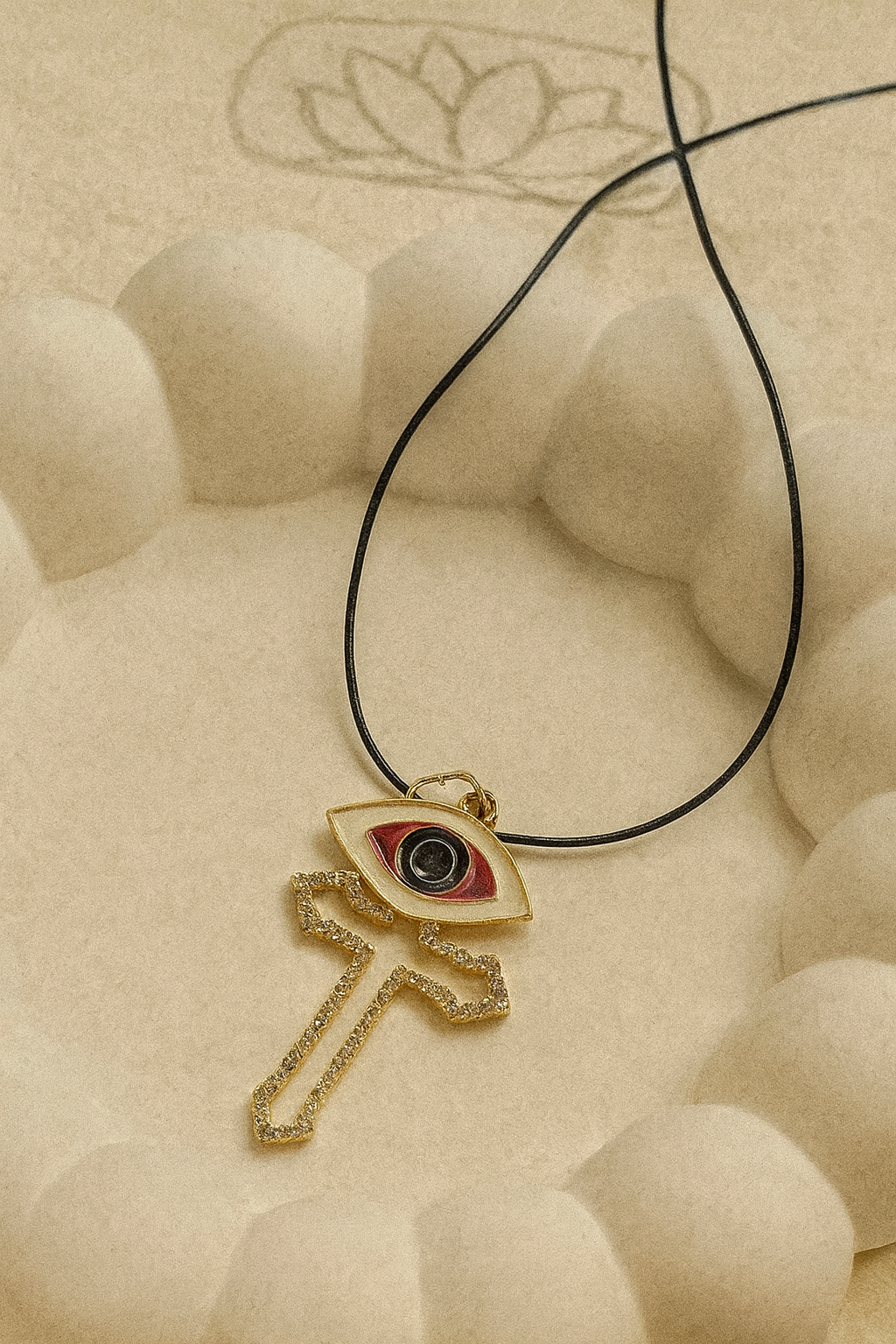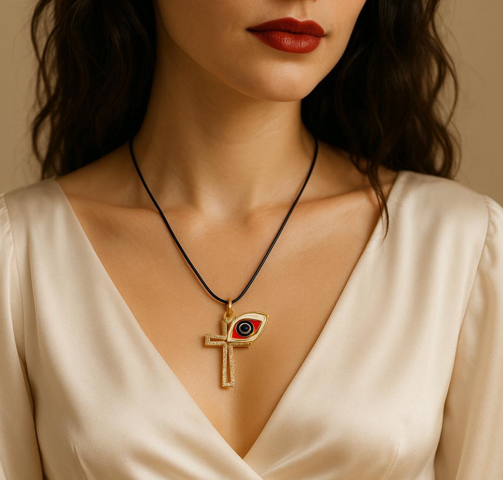 Bu tasarım, haç sembolünün güçlü duruşu ile nazar boncuğunun koruyucu anlamını bir araya getirir. Birçok kişi için güven, derinlik ve içsel güç hissini çağrıştıran dengeli bir bütünlük sunar.